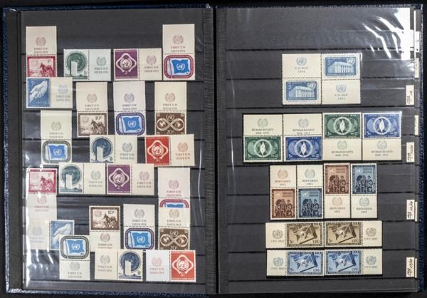 ★★(1951ca). Espectacular colección de Naciones Unidas en nuevo de las oficinas de Nueva York entre 1951 y 1971, Viena entre 1979 y 1988 y Ginebra entre 1969 y 1988, todos con borde de hoja con el logo de la ONU (sólo uno por pliego), incluye colecciones de Nueva York entre 1951 y 1977 (con hoja bloque Nº1) 1990 a 1996, Ginebra de 1969 a 1977 y 1990 a 1996 y Viena de 1990 a 1996. ALTO VALOR DE CATALOGO. A EXAMINAR.
