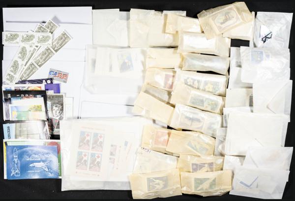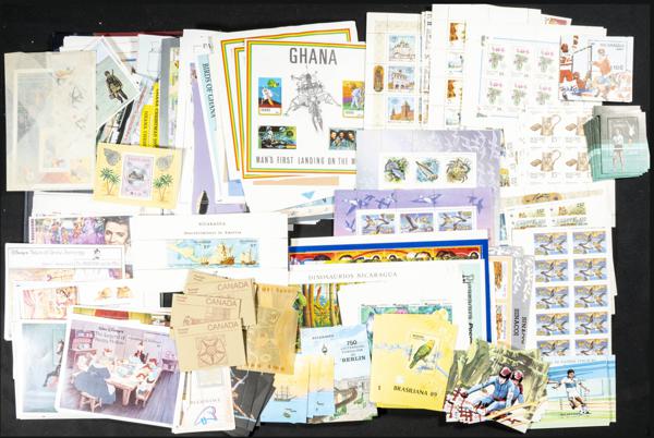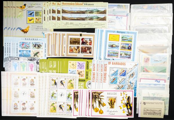 ★★/★(1950ca). Interesante conjunto de cientos (muy posiblemente más de mil) hojas bloque y minihojas de diversos paÃses en nuevo entre 1950 y 1995 con alguna repetición, todas series temáticas, la mayorÃa sin fijasellos, incluye alguna serie completa o sellos sueltos nuevos. ALTISIMO VALOR DE CATALOGO. A EXAMINAR.