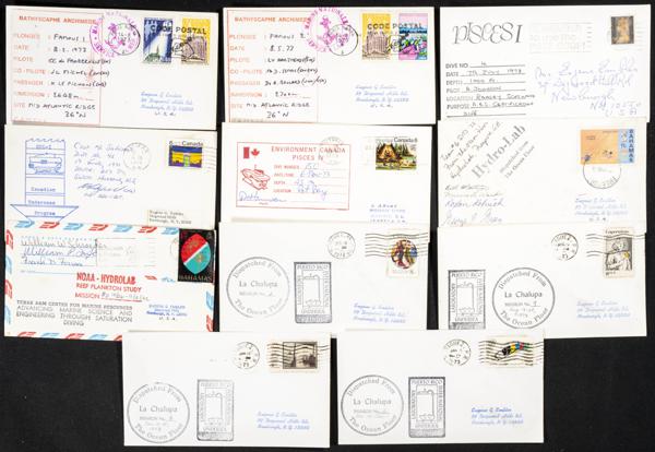 (1971ca). Interesante conjunto de once cartas de diversos paÃses, circuladas entre 1971 y 1973 con marcas de Batiscafos y bases submarinas, destacando dos del batiscafo Archimede, de la Marina Francesa. A EXAMINAR.