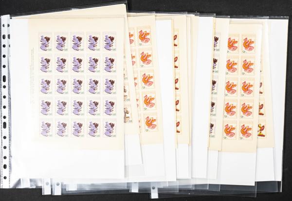 ★★(1940ca). Interesante conjunto de cientos de series completas (algún sello suelto), hojas bloque, Pruebas de Lujo y hojitas individuales en nuevo de diversos paÃses entre 1940 y 2000, organizado por temáticas como Fauna (Aves y Perros), Deportes, Navidad, Cine y Mundial 82 (montados en clasificadores), incluye series sin dentar, minihojas, asà como alguna variedad. ALTISIMO VALOR DE CATALOGO. A EXAMINAR.