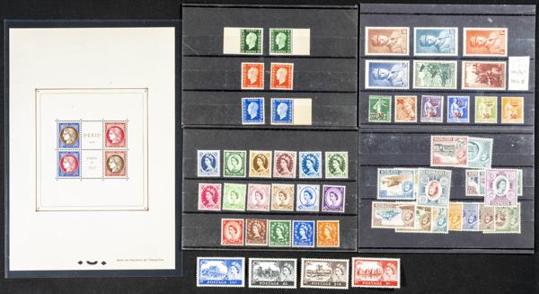 ★★/★(1937ca). Conjunto de series completas y una hoja bloque de Francia, en nuevo y varias series de Gran Bretaña y Chipre, en nuevo e incluyendo la serie no emitida de Francia (Yvert 701A/F) sin fijasellos, hojas bloque PEXIP de Francia (sellos sin fijasellos) y series de Gran Bretaña de 1952 (Básica) y 1955 (Castillos grabado normal), ambas con fijasellos. A EXAMINAR. Edifil 2024: 1.870 Euros