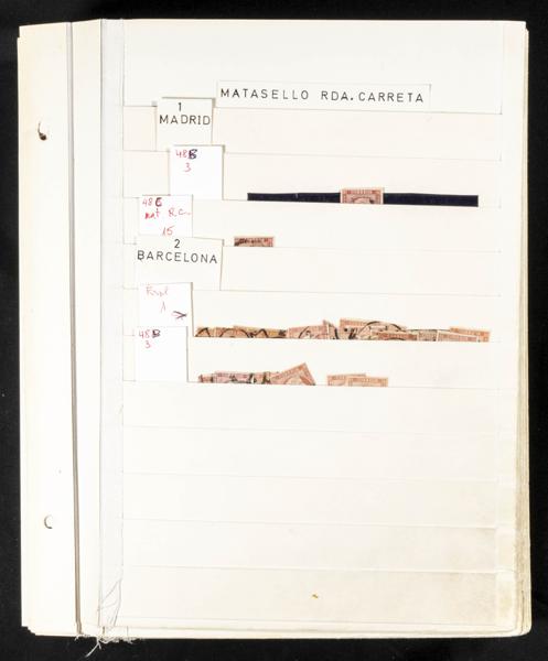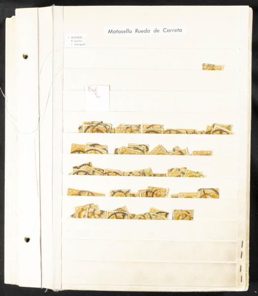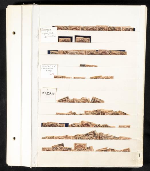 Interesante conjunto de cientos de sellos del 4 cuartos castaño de 1862 con matasellos tipo parrilla, carreta y fechador, estos últimos organizados por orden de población (muchos muy poco usuales o raros según la obra de Láiz). IMPRESCINDIBLE EXAMINAR.