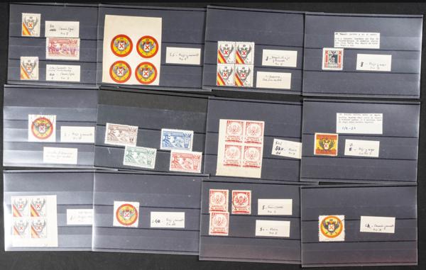 Interesante conjunto de sellos, series completas y cartas circuladas con sellos y hojas bloque de las emisiones de Requetés de 1938 (Zumalacarregui), incluye algunas variedades de sobrecarga, de dentado (alguna sin dentar), asà como otras emisiones anteriores, destacando los dos sellos de las Margaritas usados y algunas cartas con viñetas de Requetés, además de un grabado de Zumalacarregui. A EXAMINAR.