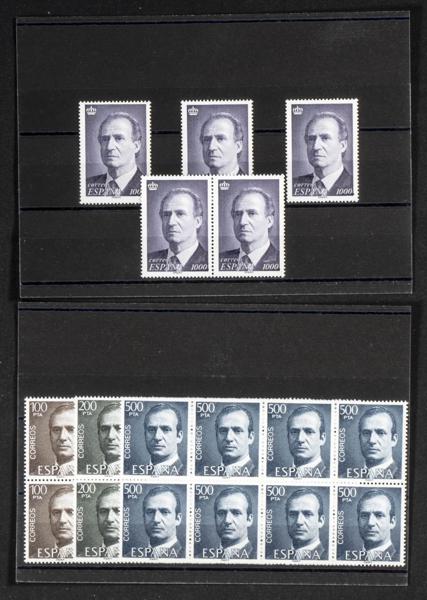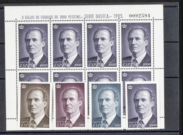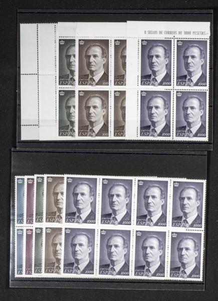 ★★ 3403(5), 2605/07(8). 1995. Cinco sellos de 1000 pts violeta de JUAN CARLOS I, incluye sellos de 100 pts, 200 pts y 500 pts de la series de los ochenta y noventa en bloques de ocho. MAGNIFICAS. Edifil 2024: 369 Euros