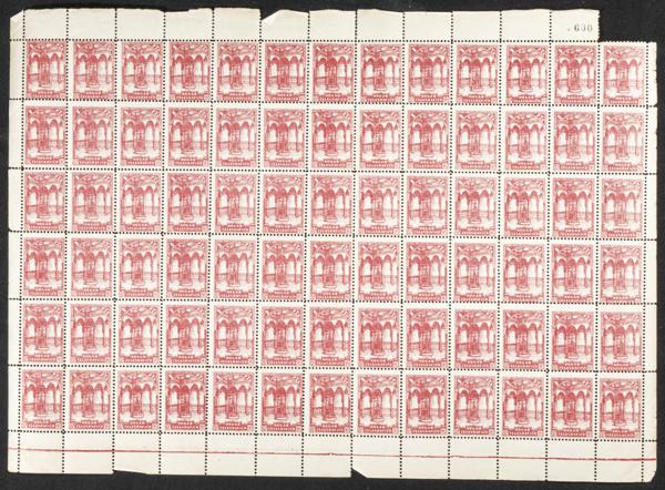 ★★ 15(78). 1938. 1 pts rosa, setenta y ocho sellos en pliego. HUERFANOS DE TELEGRAFOS. A EXAMINAR. Edifil 2024: 780 Euros