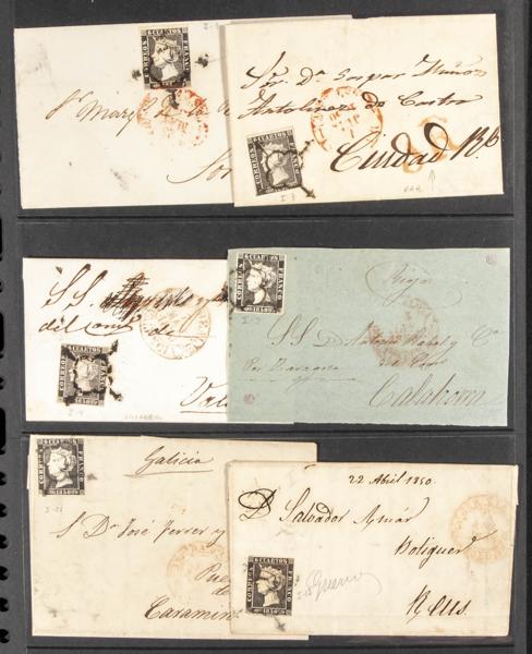 1, 1A. 1850. Conjunto de treinta cartas y cuatro frontales del 6 cuartos negro, de ambas planchas, inutilizados con matasello ARAÑA, en negro y acompañados de baezas de diferentes localidades. IMPRESCINDIBLE EXAMINAR.