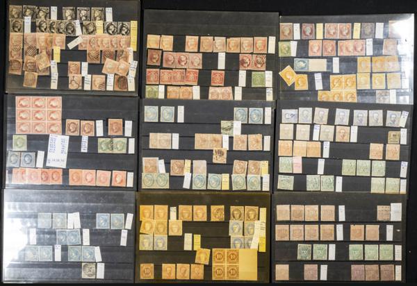 (1850ca). Conjunto-stock de sellos sueltos usados entre 1850 y 1949, organizado por orden de catálogo Edifil y con repeticiones hasta quince unidades de cada sello representado, incluye un pequeño conjunto de sellos clásicos falsos en bloques de cuatro. ALTO VALOR DE CATALOGO. A EXAMINAR.