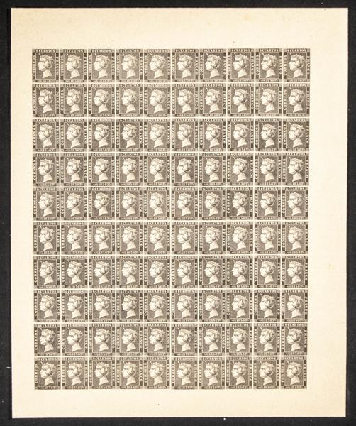 (★)/ 1F(200). 1850. Conjunto de dos pliegos completos de cien sellos del 6 cuartos negro, en nuevo y en usado (este último sin márgenes) del falso SeguÃ. A EXAMINAR.