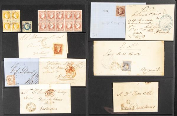 (1855ca). Conjunto de seis cartas y un frontal incluyendo además un bloque de cuatro del 4 cuartos amarillo, un bloque de ocho del 4 cuartos rojo y un sello del 2 cuartos azul (fechador en rojo), todo ello relacionado con la Comunidad Valenciana. A EXAMINAR.
