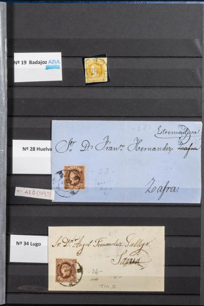 (1855ca). Interesante conjunto de más de ochenta sellos del 4 cuartos de las emisiones de 1855, 1860, 1862 y 1864, asà como quince cartas (algún frontal) de las mismas emisiones (alguna de Matrona). A EXAMINAR.