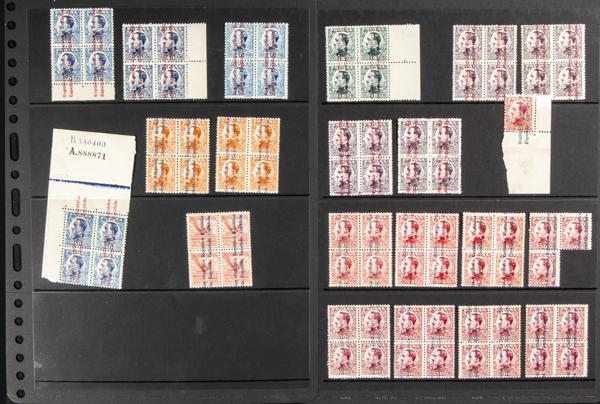 (1931ca). Interesante conjunto de sellos del 2 cts al 50 cts en bloques de cuatro o sueltos nuevos, la mayorÃa con variedades en la sobrecarga (a caballo, impresión débil, etc). A EXAMINAR.
