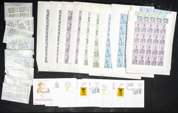 ★★/★(1920ca). Conjunto de sellos sueltos del 1º Centenario entre 1920 y 1949, en nuevo y la mayorÃa sin fijasellos, muchos en bloques de cuatro o mayores y repeticiones hasta cien sellos de cada. A EXAMINAR.