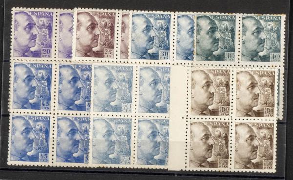 ★★ 922/26(4), 929(4), 935(4). 1940. Conjunto de diversos valores en bloque de cuatro de la emisión de Franco dentado grueso, incluyendo el 10 PTAS (Edifil Nº935), algunos de los valores presentan manchitas del tiempo. A EXAMINAR. Edifil 2024: +116,8 Euros