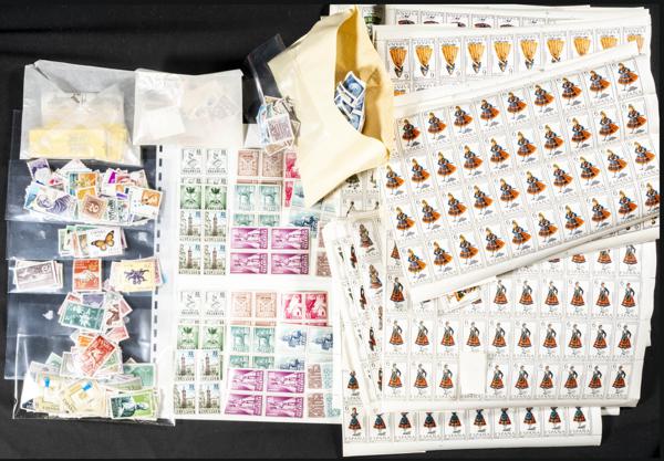 ★★(1955ca). Conjunto de miles de sellos sueltos y alguna serie completa del 2º Centenario, la mayorÃa posteriores a 1955 y hasta 1980, muchos organizados por valores en sobres, incluye más de cuarenta juegos de trajes regionales a falta de Pontevedra y varios juegos de Plan Sur de Valencia. A EXAMINAR.