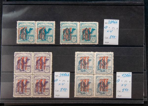 ★★ 38/39Ahh, 41Ahhcc(13),42Ahh. 1932. Conjunto de sellos de Sahara, 15 cts, cuatro sellos, 30 cts, trece sellos y 40 cts, bloque de cuatro, en nuevo y sin fijasellos con SOBRECARGA DOBLE (muy buena calidad). A EXAMINAR. Edifil 2018: 8.280 Euros