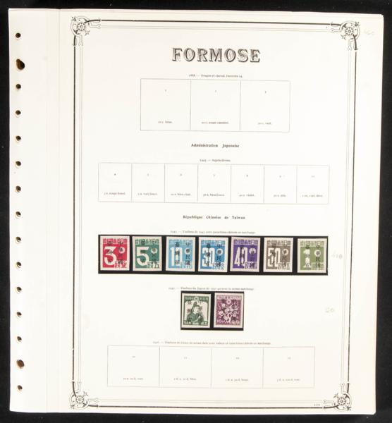 ★★/★(1945ca). Interesante colección de Formosa entre 1945 y 2000, en nuevo y muy completa a partir de 1955 e incluyendo numerosas hojas bloque, destacando DÃa del Ejército 1955 (600 Euros), 69 Aniversario Tchang Kai, Chek (250 Euros), entre otras. IMPRESCINDIBLE EXAMINAR. Yvert 2020: +5.500 Euros