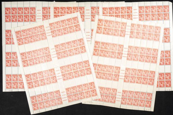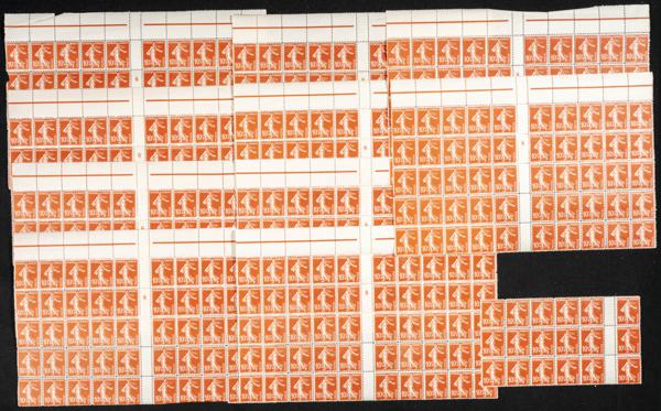 ★★Yvert 138(1100). 1907. Conjunto de mil cien sellos en bloques del 10 cts rojo (Sembradora) de Francia 1907 nuevos, muchos con interpanel. A EXAMINAR. Yvert 2024: 4.400 Euros