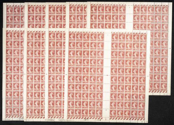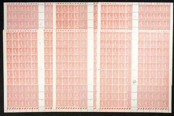 ★★Yvert 139(900). 1907. Nueve pliegos completos de cien sellos cada uno de 20 cts castaño rojo de 1907 de Francia (calidad excepcional). A EXAMINAR. Yvert 2023: 9.900 Euros