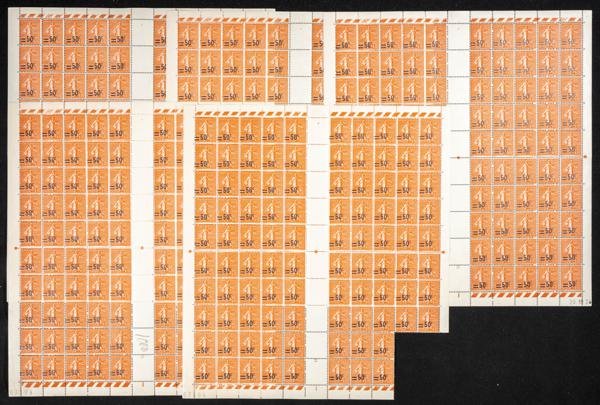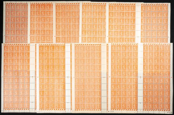 ★★Yvert 199(900). (1924ca). Conjunto de novecientos sellos en pliegos de 50 cts naranja (Sembradora) de Francia (buena calidad). A EXAMINAR. Yvert 2014: 2.070 Euros