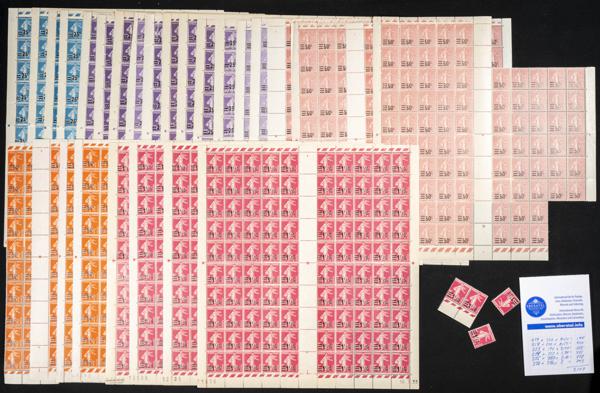 ★★ 280, 282/84A, 286, 288/89. 1932. Conjunto de más de dos mil cuatrocientos sellos de la emisión tipo Paz de 1932 de Francia, 30 cts (trescientos sellos), 45 cts (doscientos ochenta y cuatro sellos), 50 cts (doscientos cincuenta sellos), 65 cts (cuatrocientos ochenta sellos), 75 cts (cuatrocientos treinta y ocho sellos), 1 f (ciento setenta y nueve sellos), 1´50 f azul (quinientos sellos) y 1´75 f (ochenta y cuatro sellos), en pliegos o grandes bloques (buena calidad). A EXAMINAR. Edifil 2014: +5.800 Euros