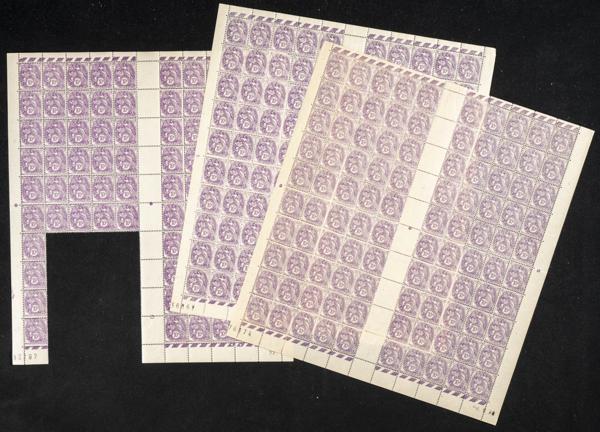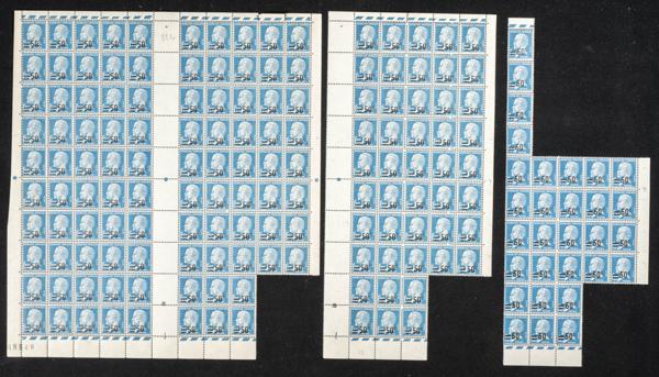 ★★Yvert 217/18, 223/25, 228. 1926. Conjunto de cerca de tres mil sellos de la emisión sobrecargada de 1926 de Francia, 25 cts sobre 30 cts azul (trescientos ochenta y ocho sellos), 25 cts sobre 35 cts violeta (ochocientos sellos), 50 cts sobre 60 cts violeta (ciento noventa y seis sellos), 50 cts sobre 65 cts rosa (doscientos cincuenta sellos), 50 cts sobre 1 f (doscientos ochenta sellos) y 1´10 f sobre 1´40 f rosa (trescientos noventa sellos), la mayorÃa en pliegos o grandes bloques (buena calidad). A EXAMINAR. Yvert 2014: +3.100 Euros