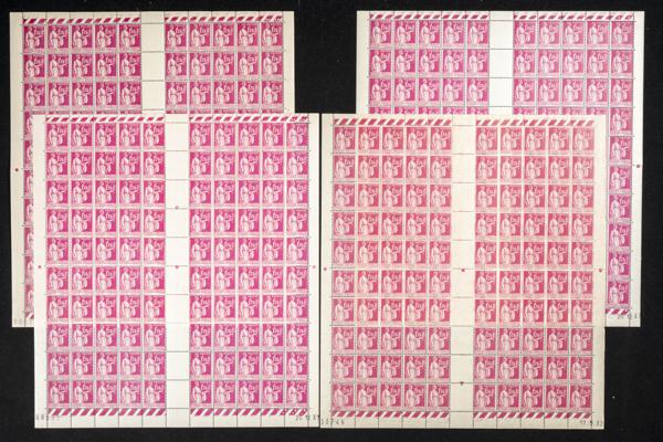 ★★Yvert 289(400). 1932. Cuatro pliegos completos (uno con dentado desprendido) de cien sellos cada uno de 1´75 f rosa lila de 1932 de Francia (muy buena calidad). A EXAMINAR. Yvert 2023: 8.800 Euros