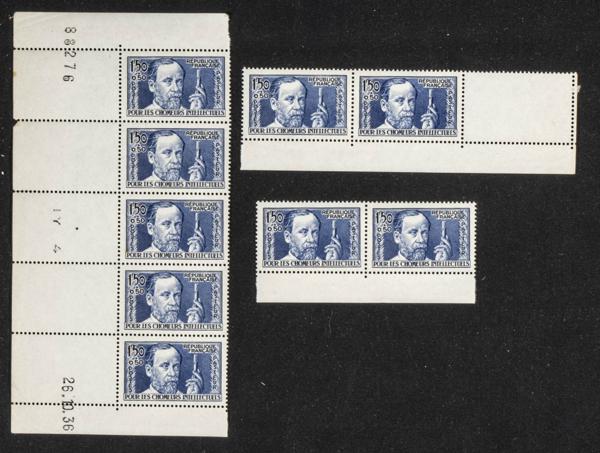 ★★Yvert 333(9). 1936. Nueve sellos de 1´50 f + 50 cts azul (Pasteur) de Francia (valor clave). A EXAMINAR. Yvert 2023: 450 Euros