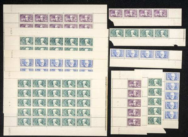 ★★Yvert 381(59), 382(34), 383(34). 1938. Conjunto de cincuenta y nueve sellos de 35 cts + 10 cts verde (Jacques Callot), treinta y cuatro de 55 cts + 10 cts violeta (Berlioz) y treinta y cuatro sellos de 65 cts + 10 cts azul (VÃctor Hugo) de Francia. A EXAMINAR. Yvert 2023: 1.319 Euros