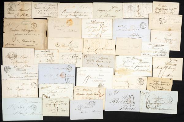 (1788ca). Interesante conjunto de más de cien cartas prefilatélicas de Francia circuladas entre 1788 y 1850, alguna con marca de franquicia o especial como O.R., P.P. o lineales, además de varias dirigidas a España. A EXAMINAR.