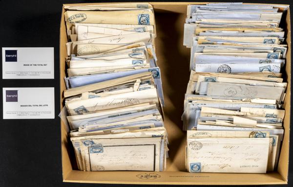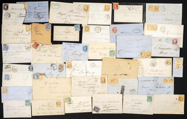 (1855ca). Interesante conjunto de varios cientos de cartas (algún frontal) de Francia circuladas entre 1856 y 1875, la mayorÃa franqueadas con sellos de 20 cts de Napoleón y de 25 cts de Ceres, incluye alguna variedad de color. A EXAMINAR.