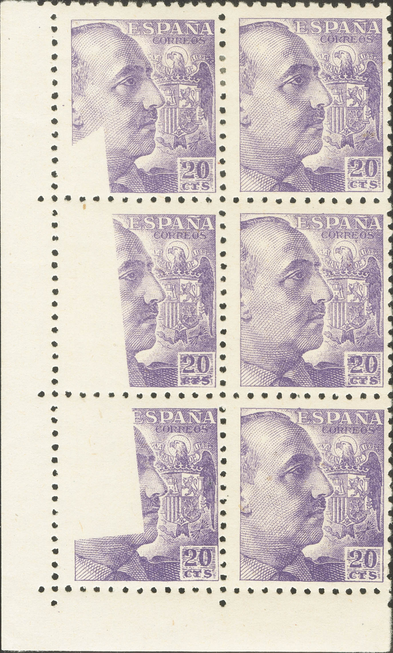 ★★/★ 922(6). 1939. 20 cts violeta, bloque de seis, borde de hoja. Tres sellos IMPRESION PARCIAL, originada por inclusión de papel. MAGNIFICO.