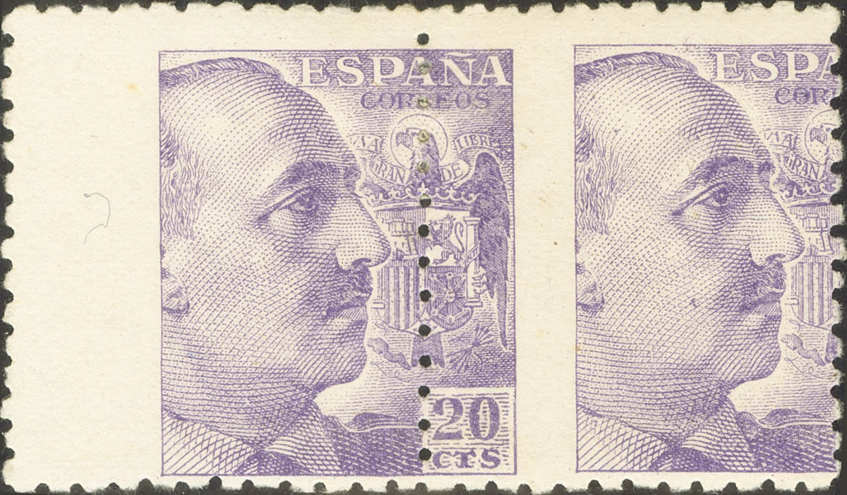 ★ 922dv(2). 1939. 20 cts violeta, pareja. DENTADO VERTICAL DESPLAZADO. MAGNIFICA. Edifil 2021: +43 Euros