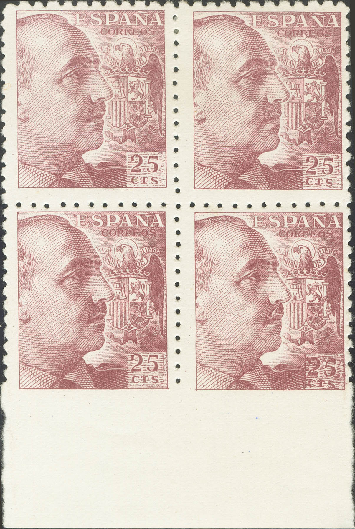 ★★/★ 923(2), 923smz(2). 1939. 25 cts lila carmín, bloque de cuatro, borde de hoja. Dos sellos SIN DENTAR EL MARGEN INFERIOR. MAGNIFICO.