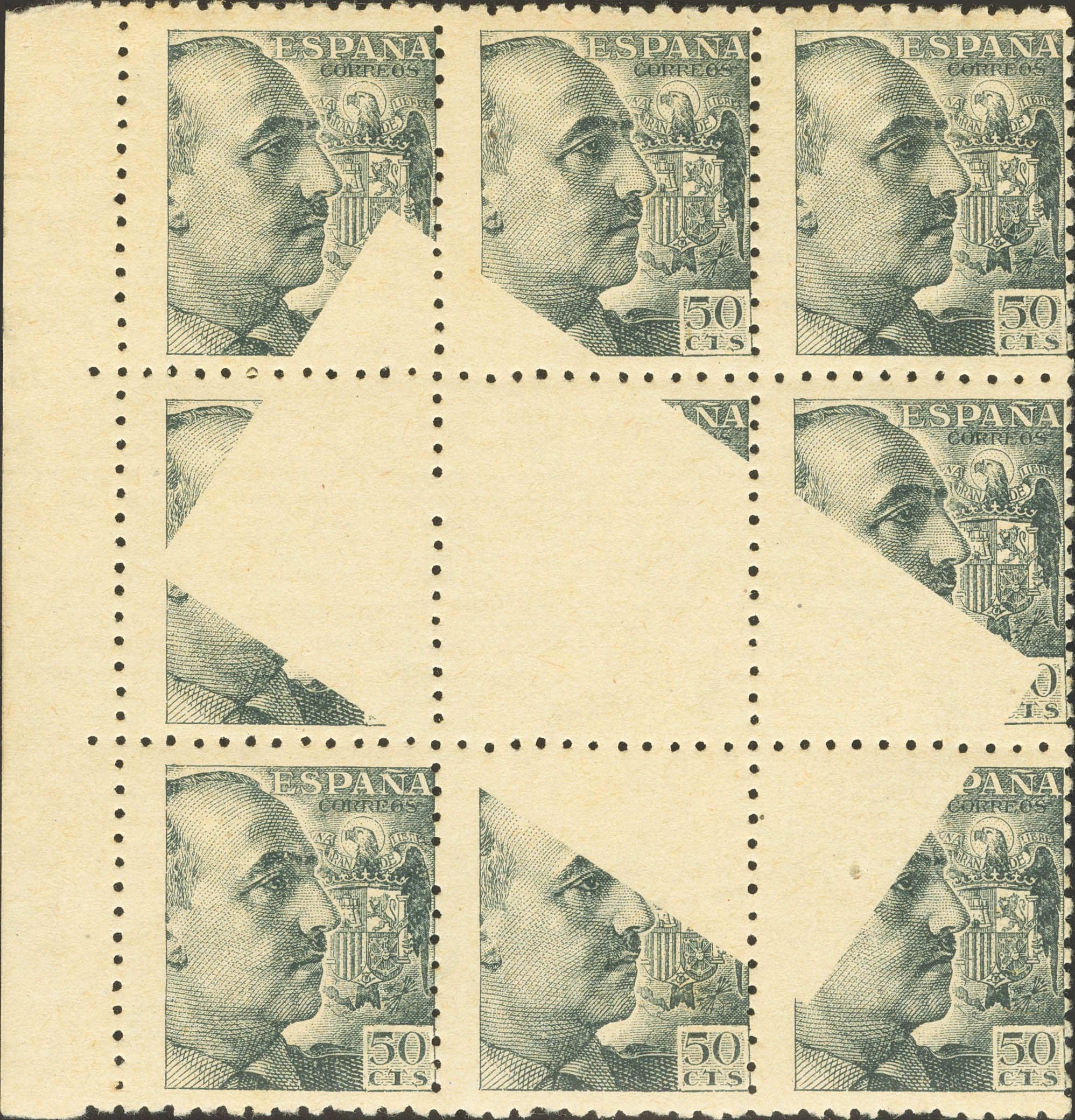 ★★/★ 927(9). 1939. 50 cts gris, bloque de nueve. Siete sellos IMPRESION PARCIAL, originada por inclusión de papel. MAGNIFICO.