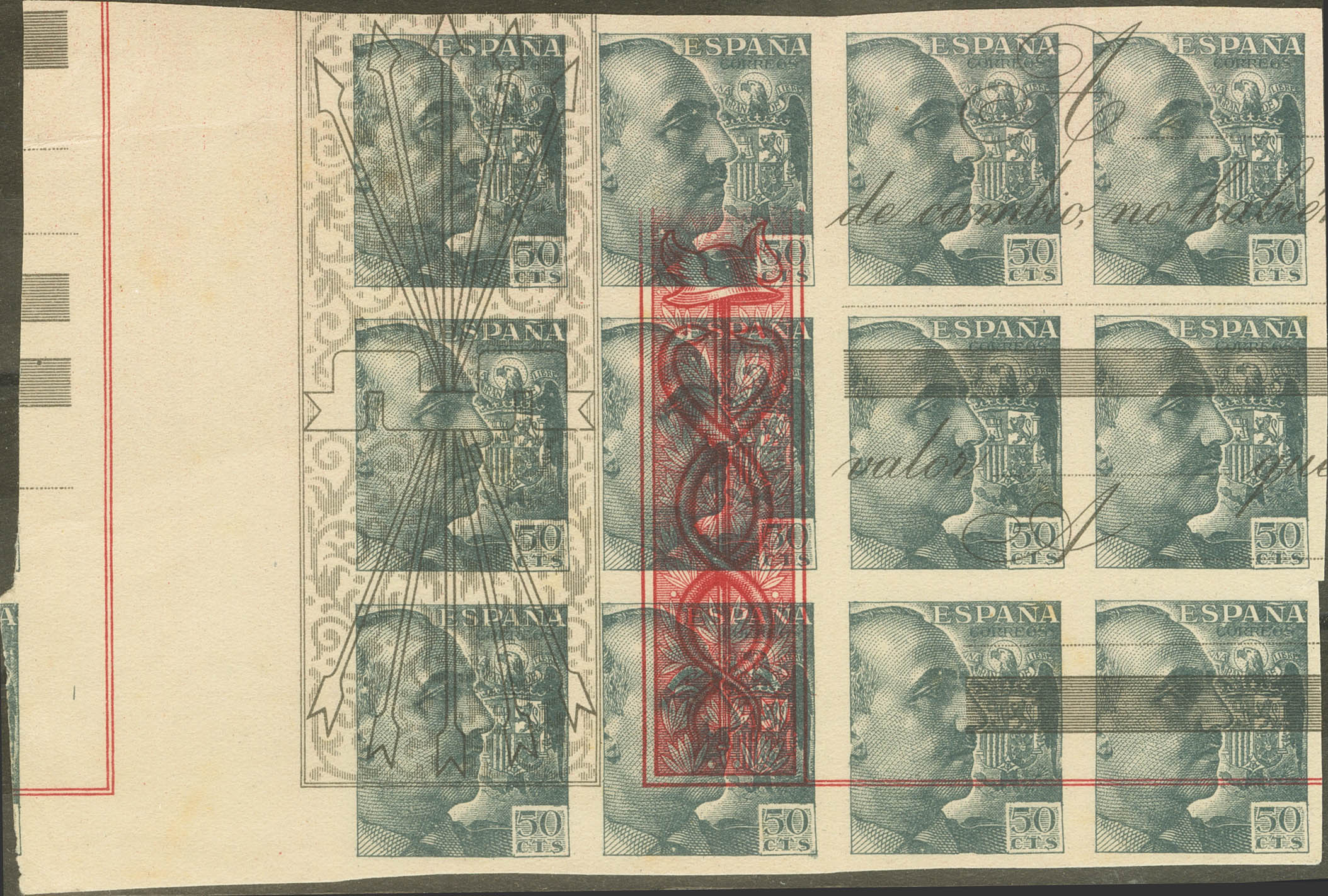 (★) 927P(12). 1939. 50 cts gris azul, bloque de doce. ENSAYO DE COLOR y SIN DENTAR, impreso sobre letra de cambio. MAGNIFICO, MUY ESPECTACULAR. (Gálvez 3666)