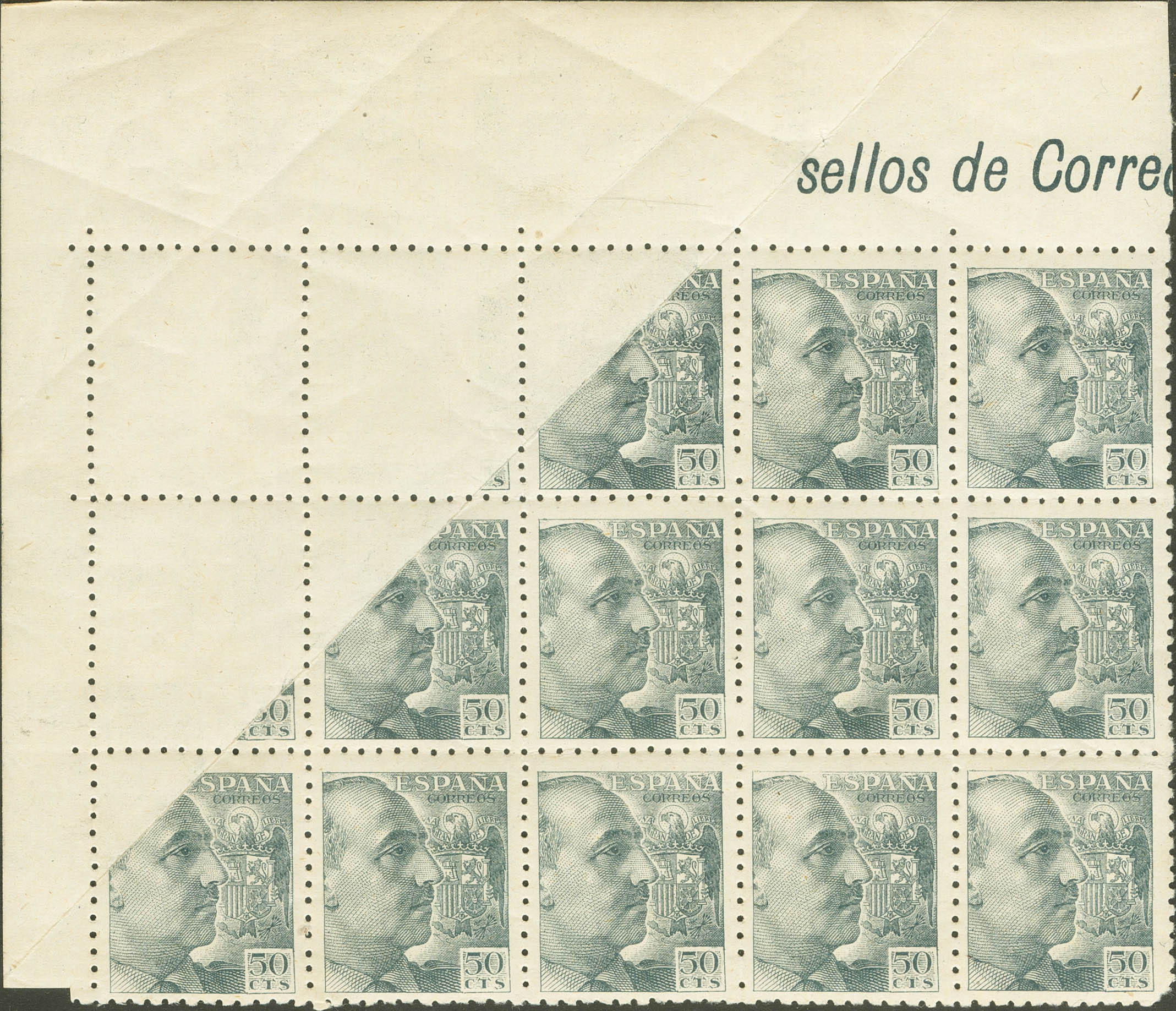 ★★/★ 927(15). 1939. 50 cts gris, bloque de quince, esquina de pliego. Seis sellos IMPRESION PARCIAL o TOTAL, originada por pliegue de papel. MAGNIFICO Y ESPECTACULAR BLOQUE.