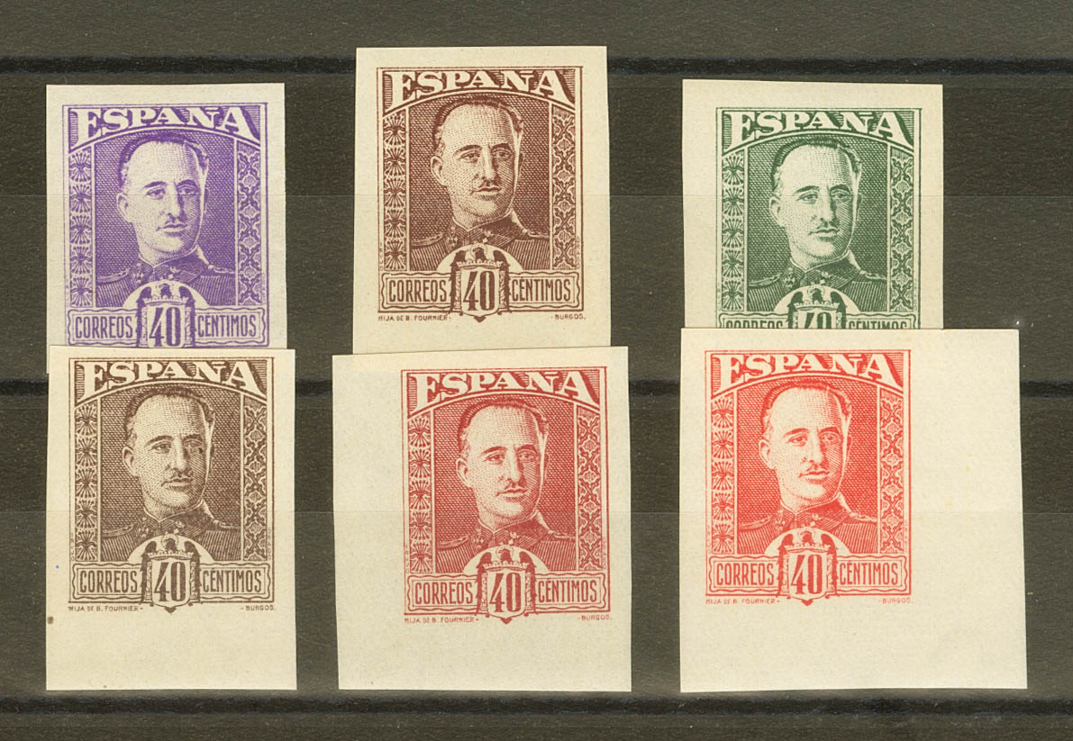 ★★1940. Conjunto de seis ENSAYOS DE COLOR y SIN DENTAR, de un diseño no adoptado de 40 cts con la efigie de Franco, realizado por Fournier. MAGNIFICO Y RARO.