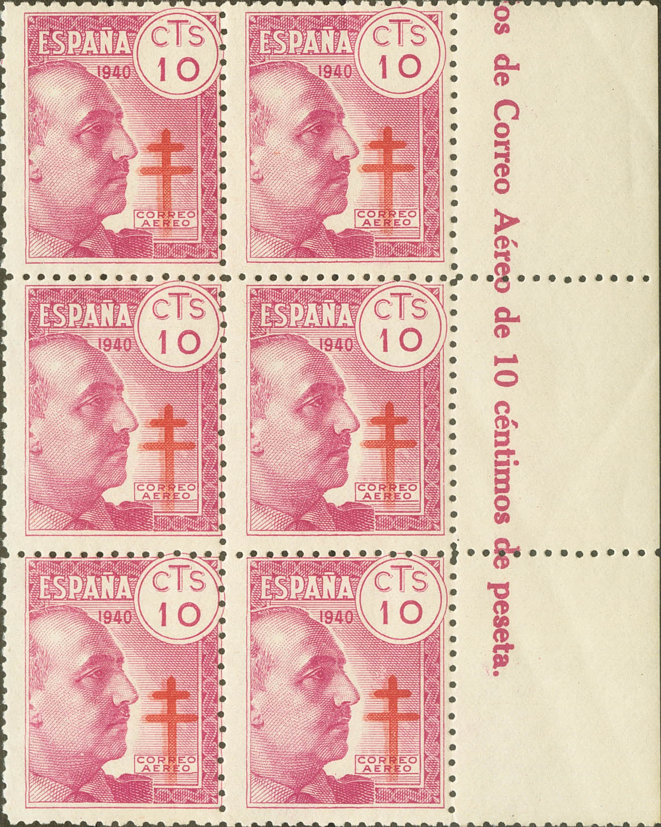 ★★ 939ed(6). 1940. 10 cts rosa, bloque de seis y borde de hoja. DOBLE CRUZ DE LORENA. MAGNIFICO. Edifil 2021: 390 Euros