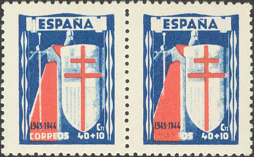 ★★ 972, 972t. 1944. 40 cts+10 cts azul y rojo, pareja. Un sello variedad SIN ESPADA y "CORRE" DE CORREOS. MAGNIFICA. Edifil 2021: ++40 Euros