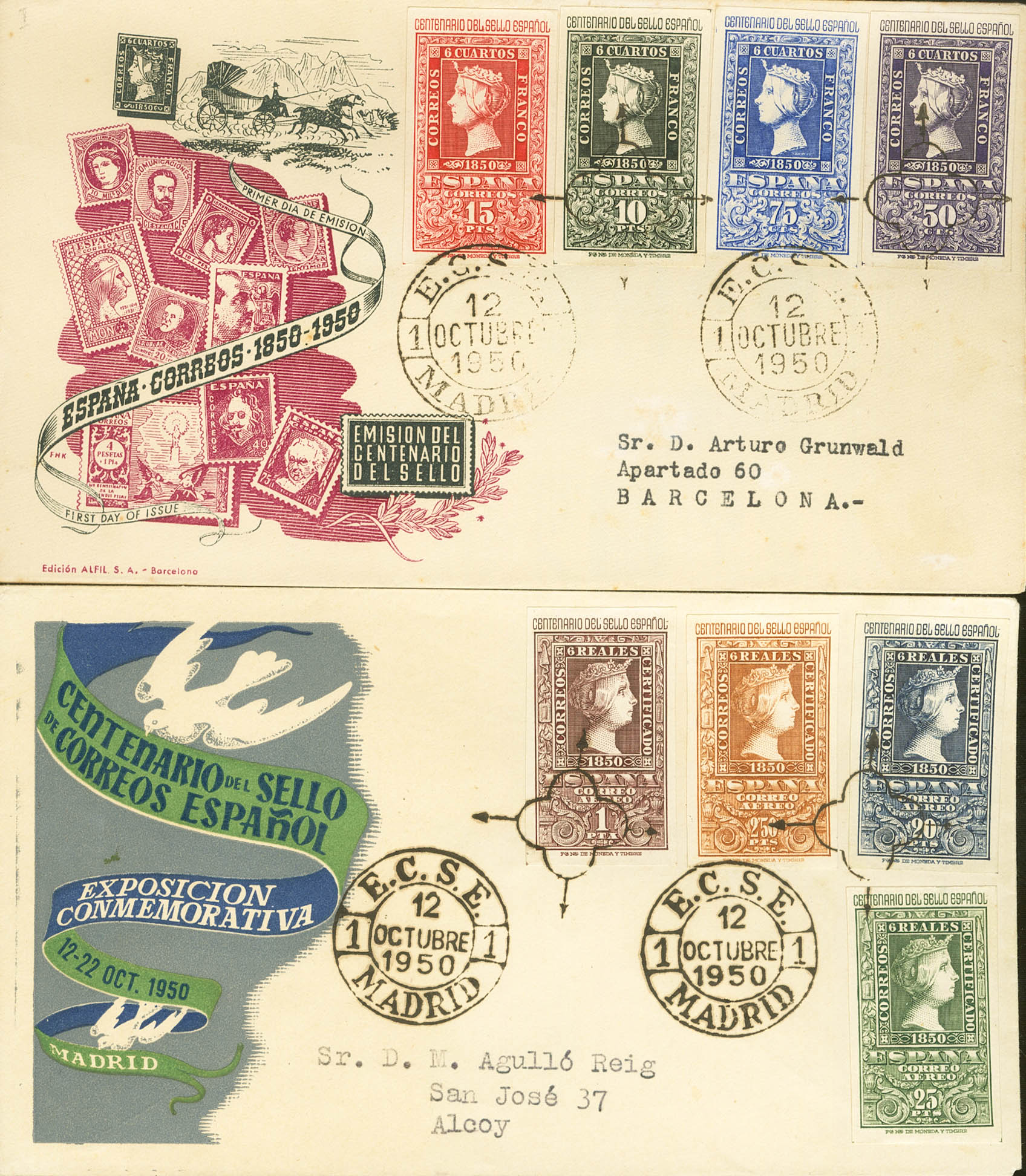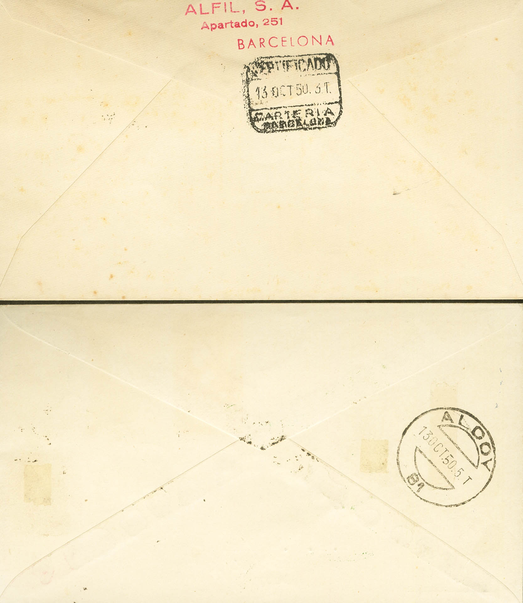 1075/82. 1950. Serie completa. Sobres de Primer día circulados de ALCOY a BARCELONA. Al dorso llegada. MAGNIFICOS. Edifil 2024: 875 Euros