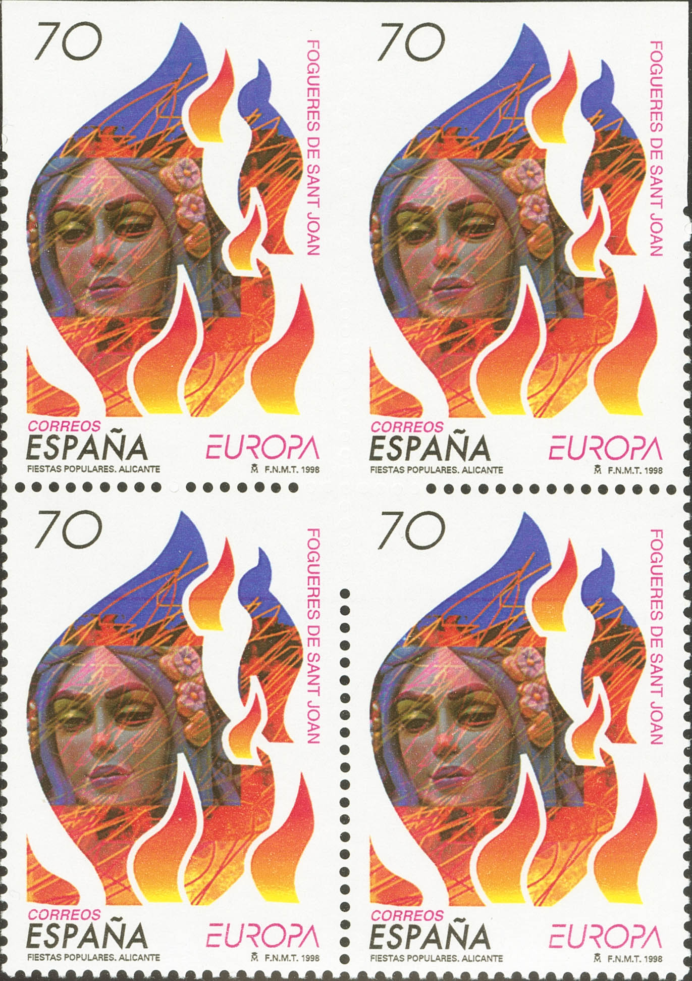 ★★ 3542dw(2), 3542(2). 1998. 70 pts, bloque de cuatro. Pareja superior PARCIALMENTE DENTADO. MAGNIFICO. Edifil 2010: 1.000 Euros