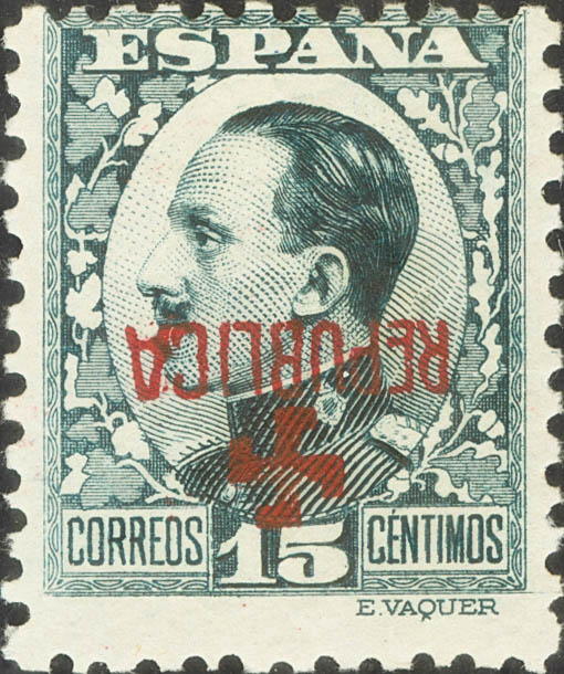 ★ 4hi. 1931. 15 cts gris azul (NºB.421.206). SOBRECARGA INVERTIDA. MAGNIFICO Y RARISIMO, SOLO SE EMITIERON VEINTICINCO SELLOS. Cert. CEM.