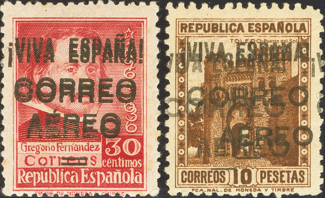 ★ 76hh, 80hh. 1937. 30 cts carmín y 10 pts castaño. SOBRECARGA DOBLE. MAGNIFICOS Y RAROS. Edifil 2017: 162 Euros