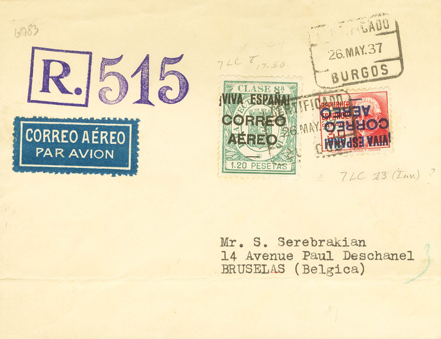 74hi, 63. 1937. 30 cts rosa SOBRECARGA INVERTIDA y 1´20 pts verde. Certificado de BURGOS a BRUSELAS (BELGICA). MAGNIFICA.