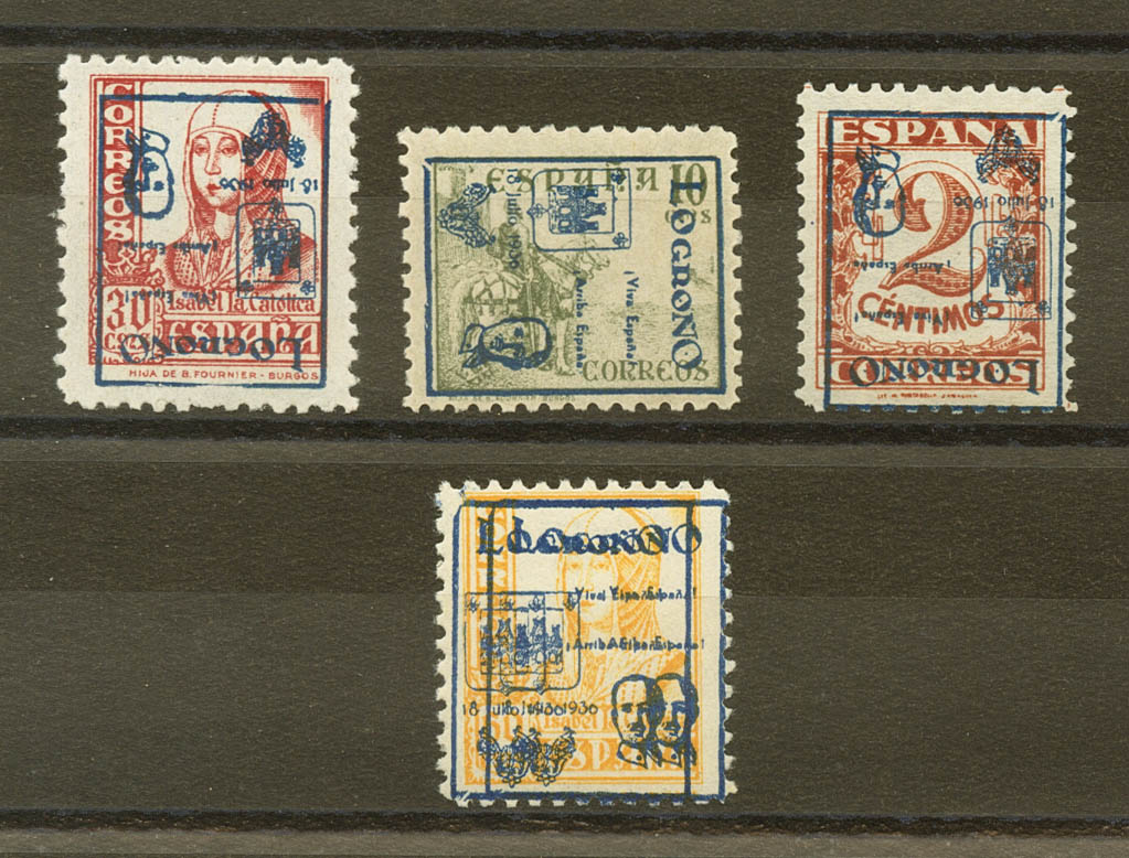 ★★/★ 3hi, 6hi, 10hi, 13hh. 1937. 2 cts castaño rojo, 10 cts verde y 30 cts rosa. SOBRECARGA INVERTIDA y 60 cts amarillo SOBRECARGA DOBLE. MAGNIFICOS. Edifil 2017: 74,5 Euros