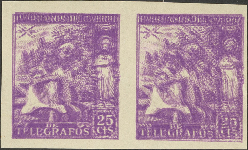 ★★ 19eds(2). 1938. 25 cts violeta, pareja. Variedad DOBLE IMPRESION y SIN DENTAR. MAGNIFICO. Edifil 2017: 860 Euros