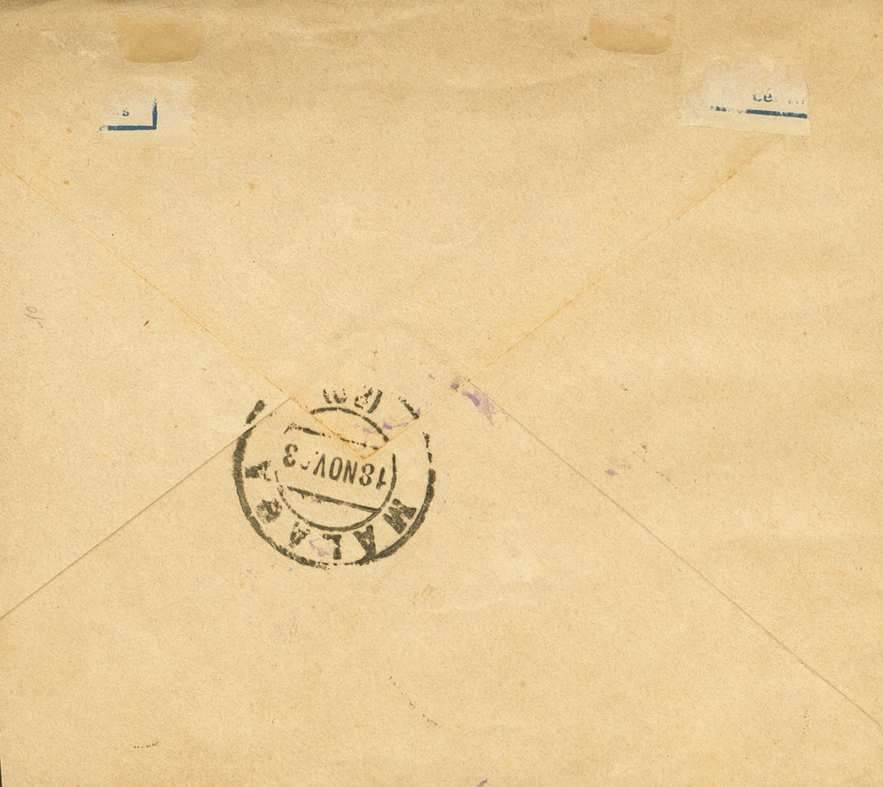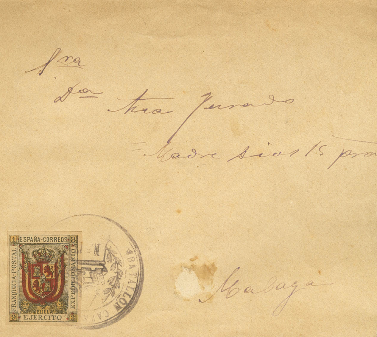 1s. 1893. Sin valor SIN DENTAR, negro, rojo y amarillo. Dirigida a MALAGA. Matasello BATALLON CAZADORES, al dorso llegada. MAGNIFICA Y RARA.