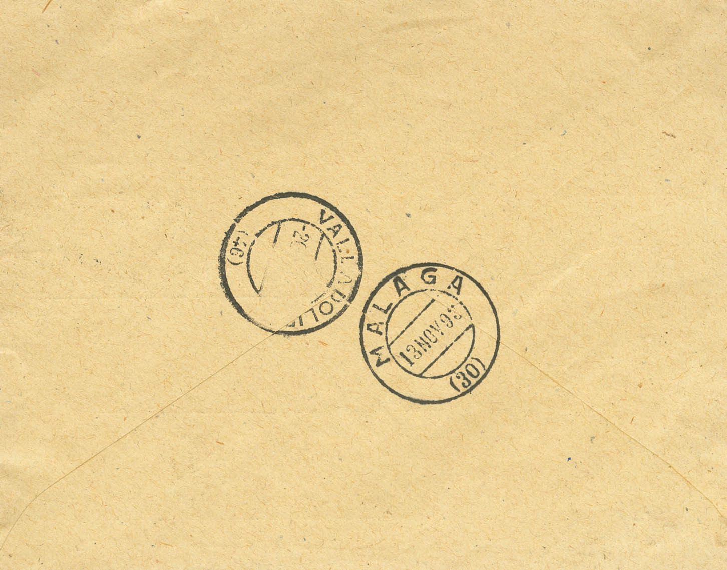 32. 1893. Sin valor, azul, borde de hoja. MELILLA a VALLADOLID. Matasello MELILLA / MALAGA, al dorso llegada. MAGNIFICA Y RARA.