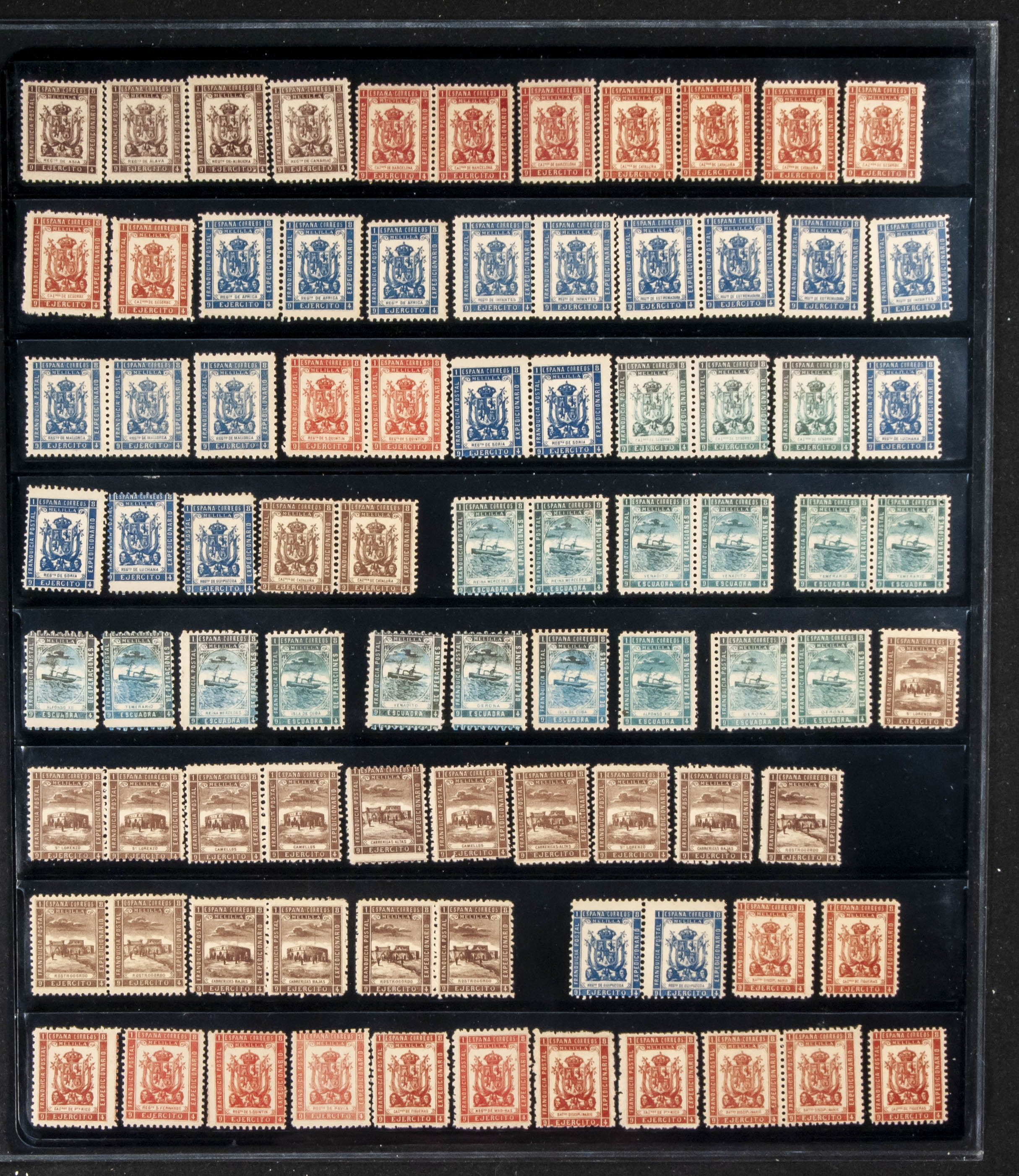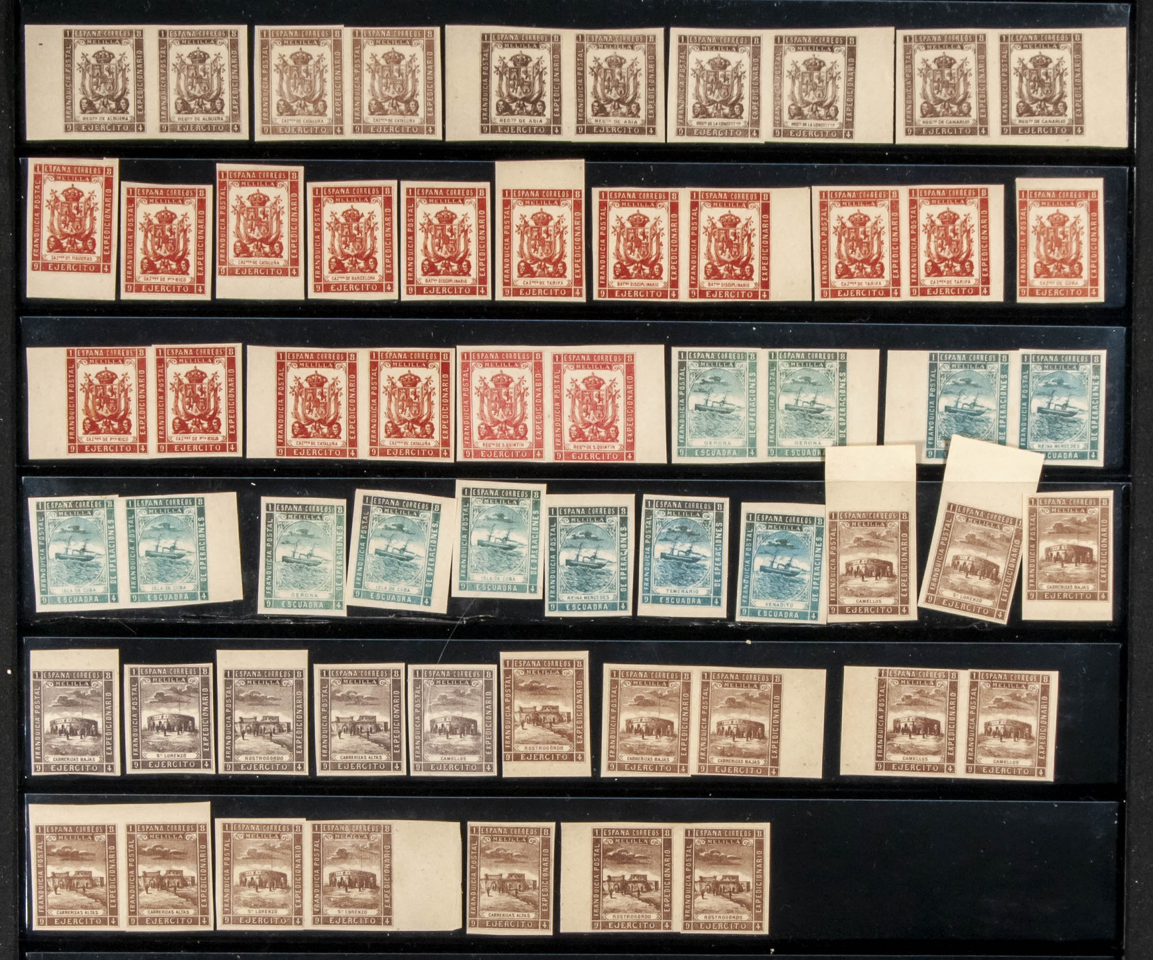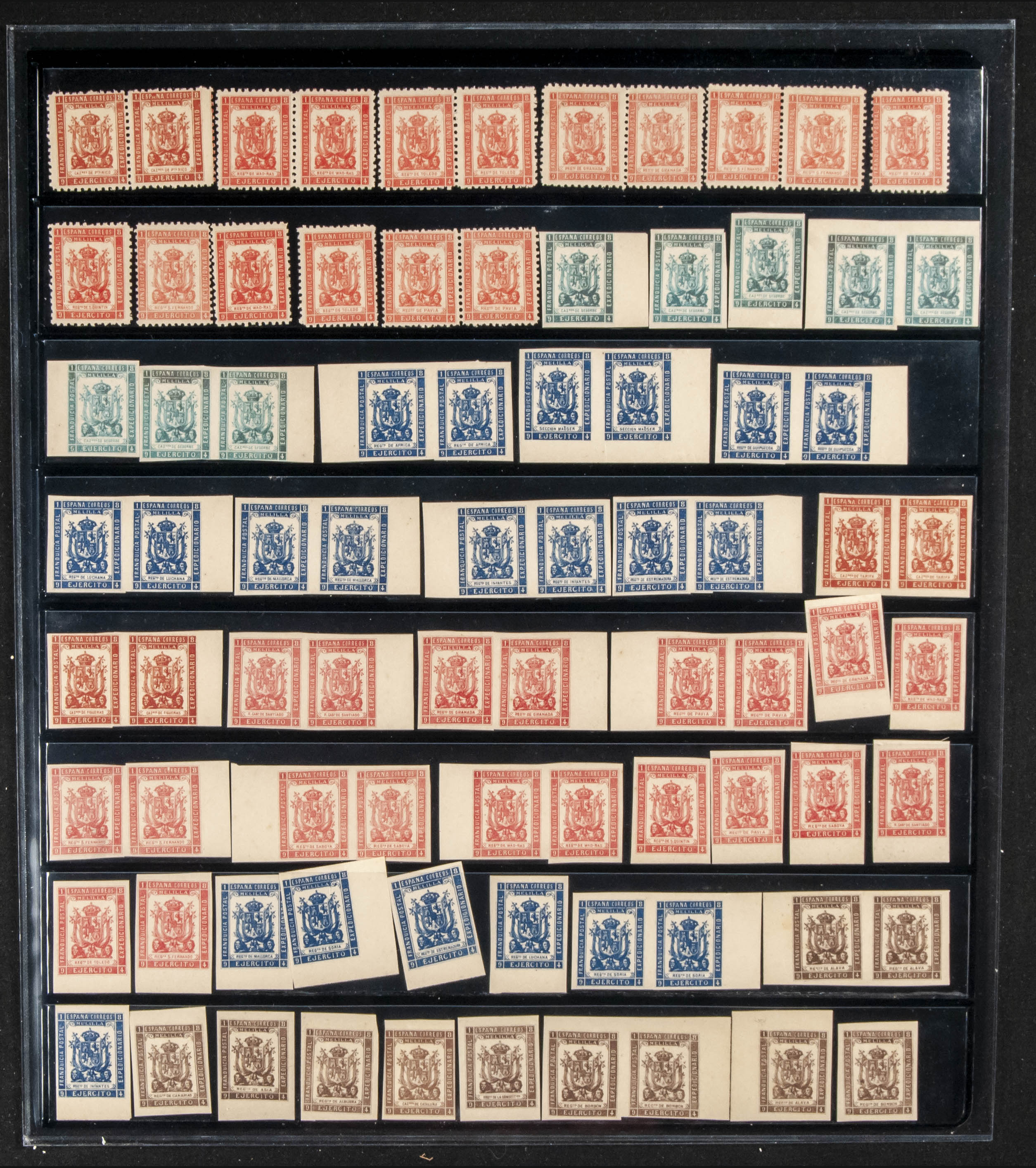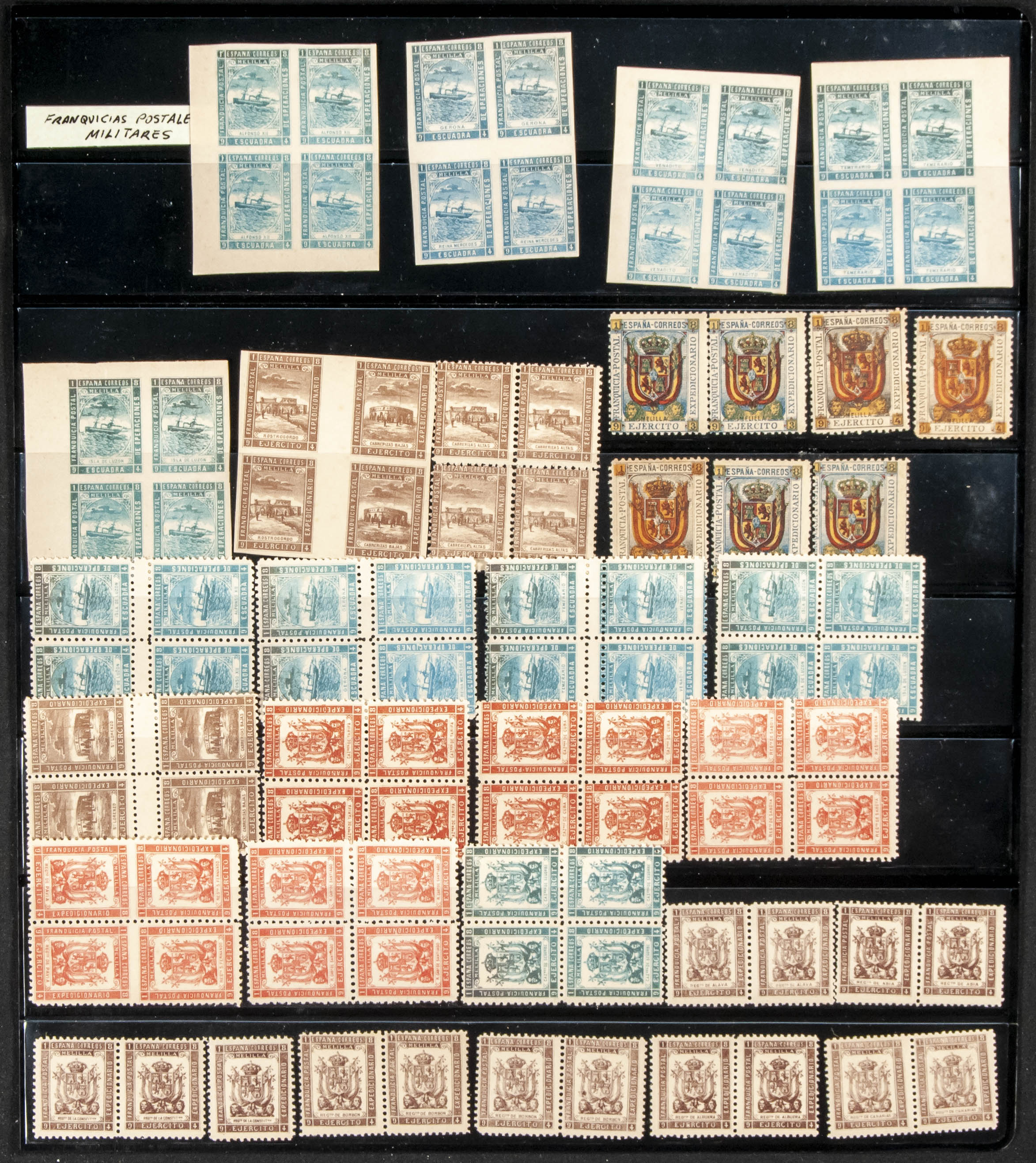★/(★)(1893ca). Conjunto de series completas y algún sello suelto, dentados y sin dentar, de Franquicias Militares entre 1893 y 1894, en nuevo. MAGNIFICAS.