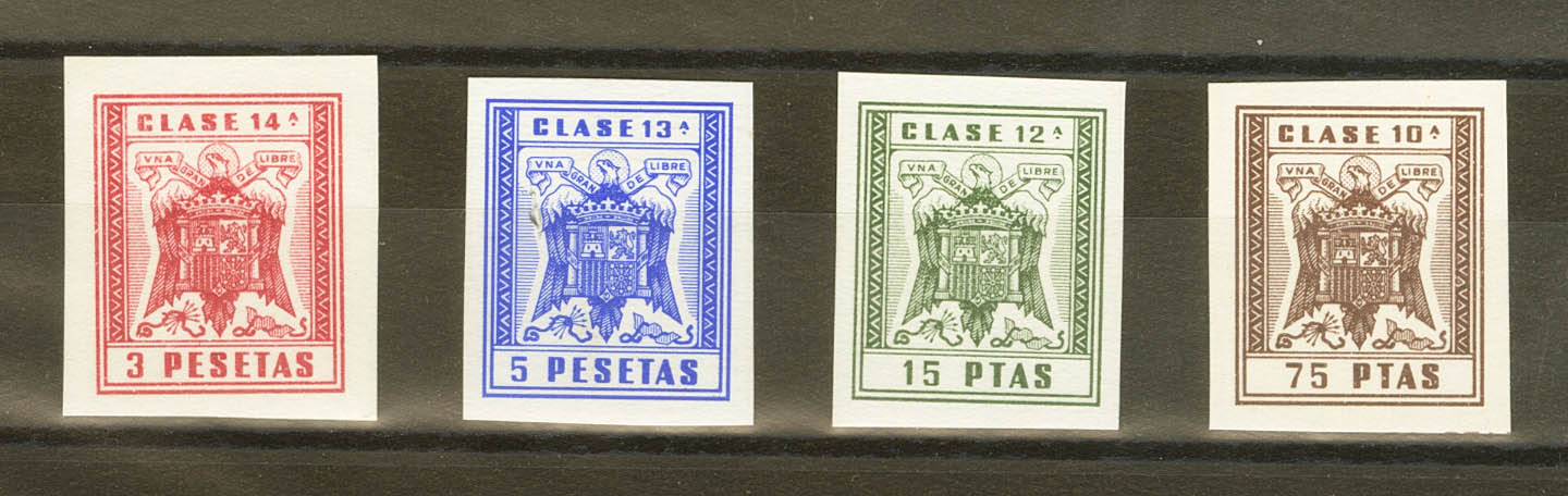 (★)(1975ca). POLIZAS 1975. 3 pts rosa, 5 pts ultramar, 15 pts verde y 75 pts castaño. ENSAYOS DE PLANCHA, de un diseño no adoptado. MAGNIFICOS Y RAROS.